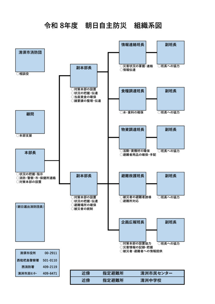 朝日では、地域の安全を守るために「自主防災組織体制」を整えています。これは、災害時に住民同士が協力し合い、迅速かつ適切に対応できるようにするための仕組みです。日ごろから防災意識を高め、訓練を行うことで、いざという時に備えています。